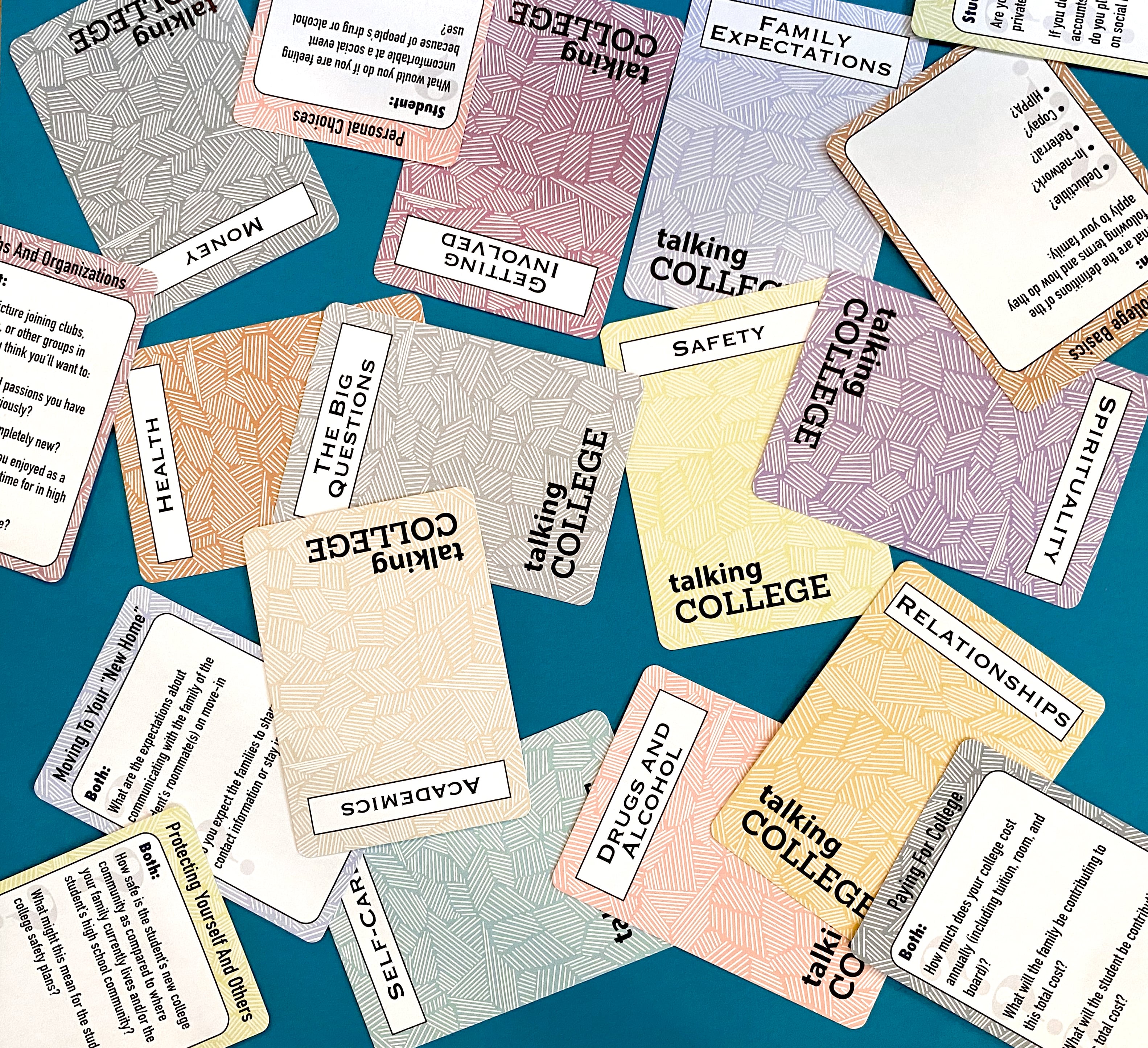 The Talking College™ cards provide insider tips and conversation prompts in a framework that elicits productive conversations about the challenges facing first-year college students. We believe that preparedness is key to a successful college transition. Practicing new routines and discussing unfamiliar and potentially challenging scenarios in advance offers almost-college students reassurance that the unknown isn’t totally out of their control.